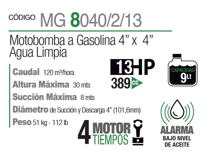 Caudal 70 m³/hora Altura Máxima 27 mts Succión