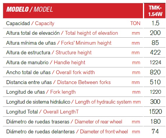Altura mínima 52mm Distancia entre uñas de 820mm