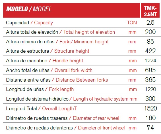 Altura mínima 52mm Distancia entre uñas de 820mm