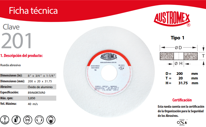 Rueda vitrificada blanca de 8" x 3/4" G46
