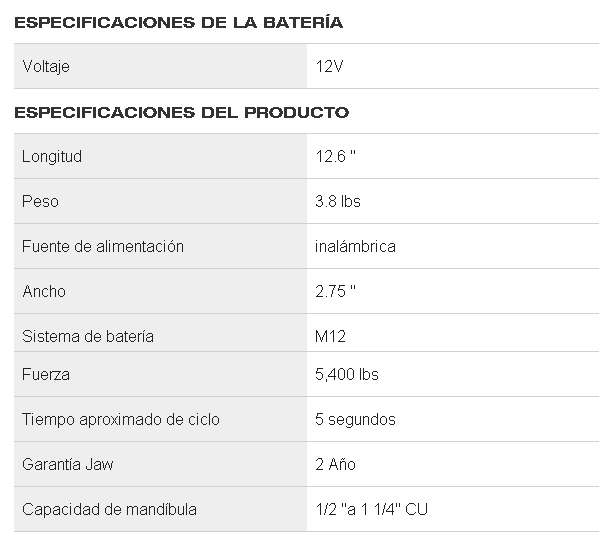 Compatible con todas las baterías y cargadores M12 ™ Se puede operar con una mano y entregar hasta 5400 lbs. de fuerza