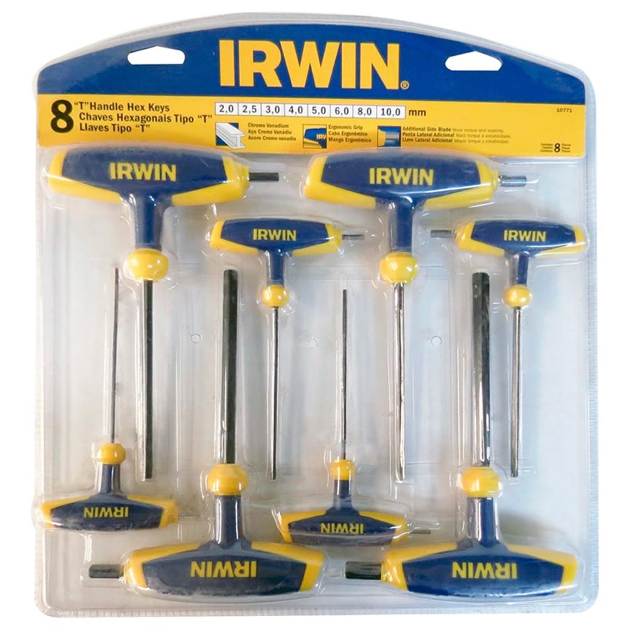 Un juego de llaves hexagonales con mango en T de 8 piezas de Irwin fabricado en acero de cromo-vanadio resistente y duradero.