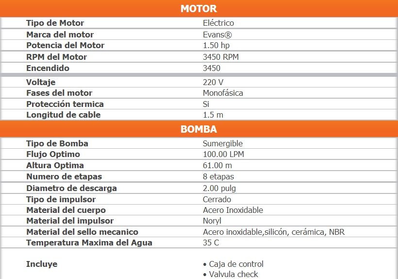 Bomba sumergible de pozo 61m 1.5HP 220V