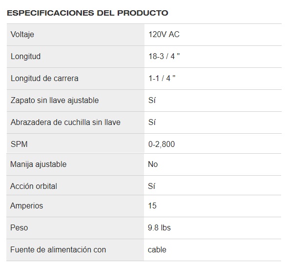 Cortes por minuto (SPM) sin carga: 0 - 2800