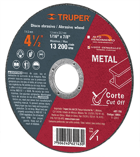 Disco para corte de metal, tipo 1, diámetro 4-1/2
