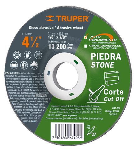 Disco para corte de piedra, tipo 27, diámetro 4-1/2