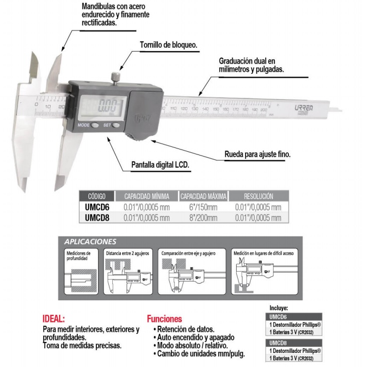 Graduación dual en milímetros y pulgadas. Pantalla digital de LCD.