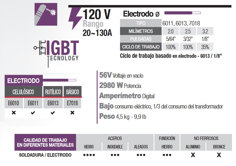 56V Voltaje en vacío 5340 W Potencia Bajo consumo