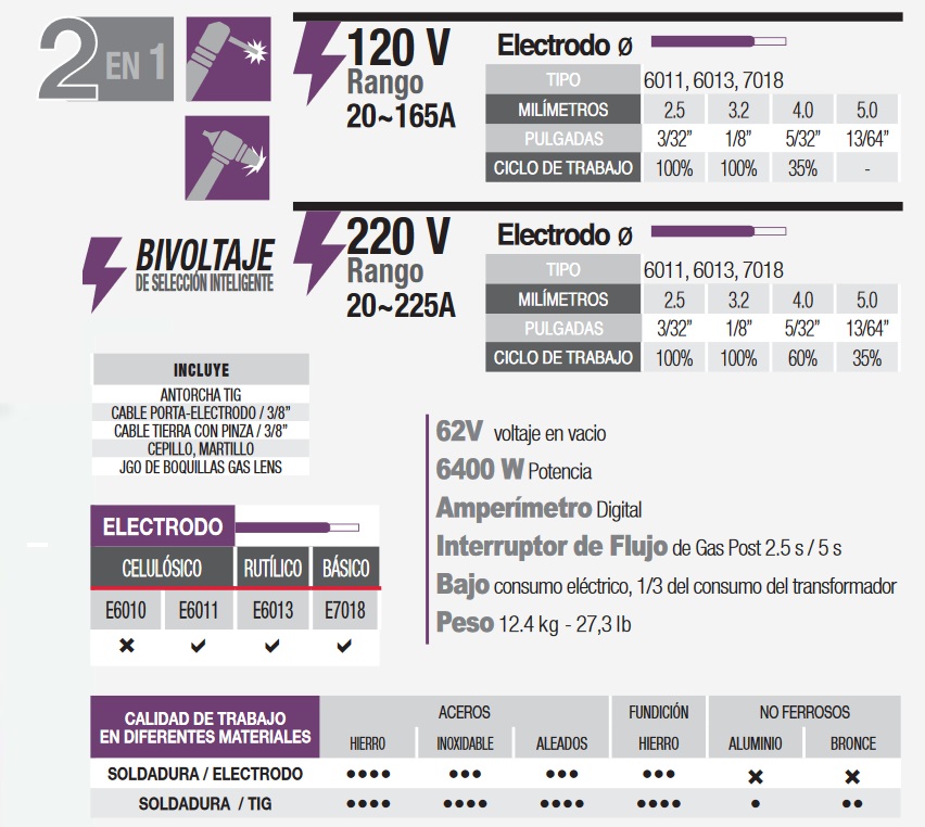 Potencia : 160 AMP Electrodo : ¯ 1,6 a 3,25 mm Re