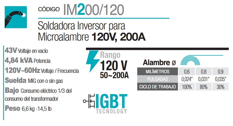 Ciclo de trabajo: 100% a 155amp - 60% a 200amp