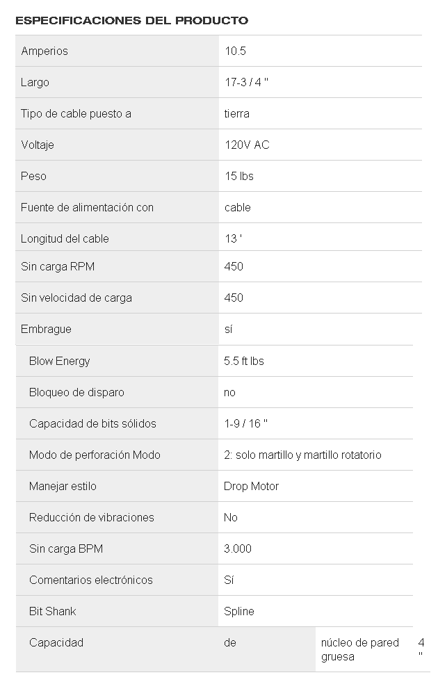 Potente mecanismo de martillo: proporciona 5.5 ft-lbs (7.5J) de energía de impacto para la perforación en áridos duros