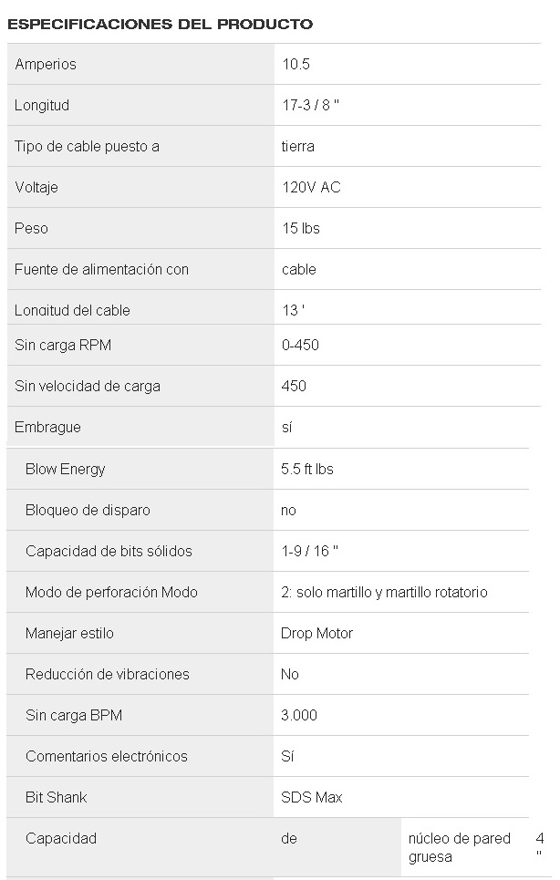 Potente mecanismo de martillo: proporciona 5.5 ft-lbs (7.5J) de energía de impacto para la perforación en áridos duros