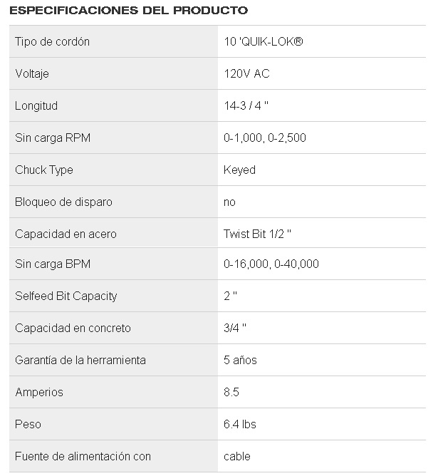 Potente motor de 8,5 amperes de doble velocidad: optimizado para fijación de hormigón con protección de sobrecarga