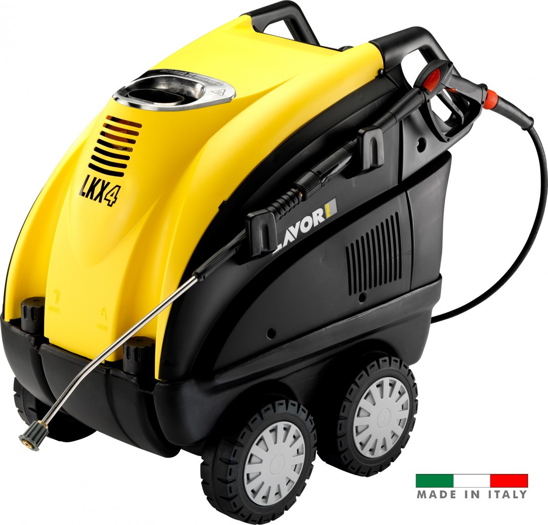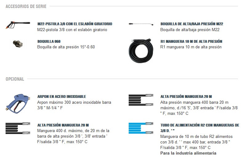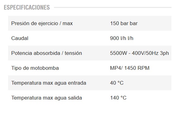 Motor eléctrico 4 polos (1450 RPM) con protección térmica y con enfriamiento por aguaBomba lineal con tres pistones cerámicos, cabezal en latón con válvula by-pass incorporada