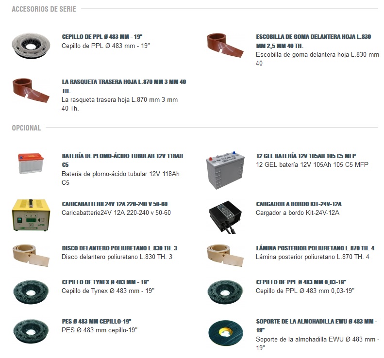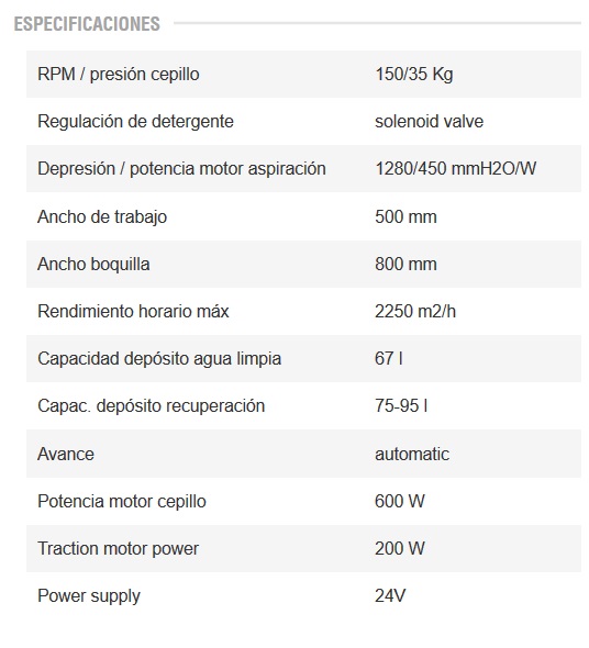 Diseñado para la limpieza de grandes superficies (hasta 2.200 m²)Panel de control con mandos de fácil uso, regulador velocidad de avance, selector función de lavado y aspirado, indicador de nivel de carga de la baterÃa con acción inhibitoria progresiva en la función del cepillo, aspiración y tracción, indicador del sentido de la marcha, llave de encendido general