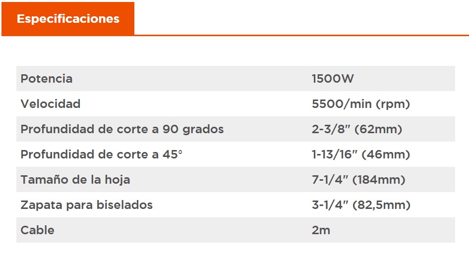 Incluye sierra circular, (1) hoja para sierra de 18 dientes de carburo, llave y guía paralela.