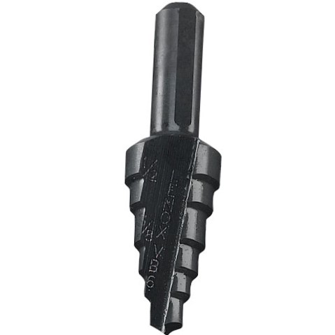 Broca escalonada para realizar cortes más rápidos y sin rebaba, con punta diseñada para penetrar más rápido en el material gracias al recubrimiento con óxido resistente al vapor.