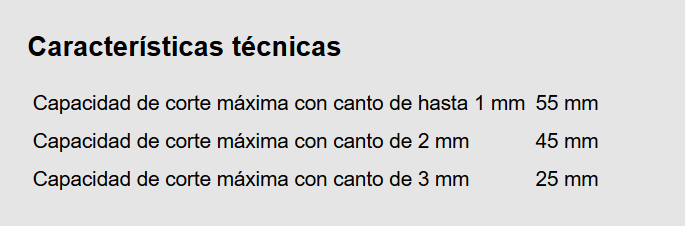 Corta cantos de hasta 55 mm de ancho y 1 mm de espesor o de 25 mm de ancho y 3 mm de espesor.