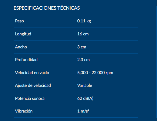 Velocidad variable (de 5 000 a 22 000): para aplicaciones de precisión en proyectos de bricolaje y artesanía.