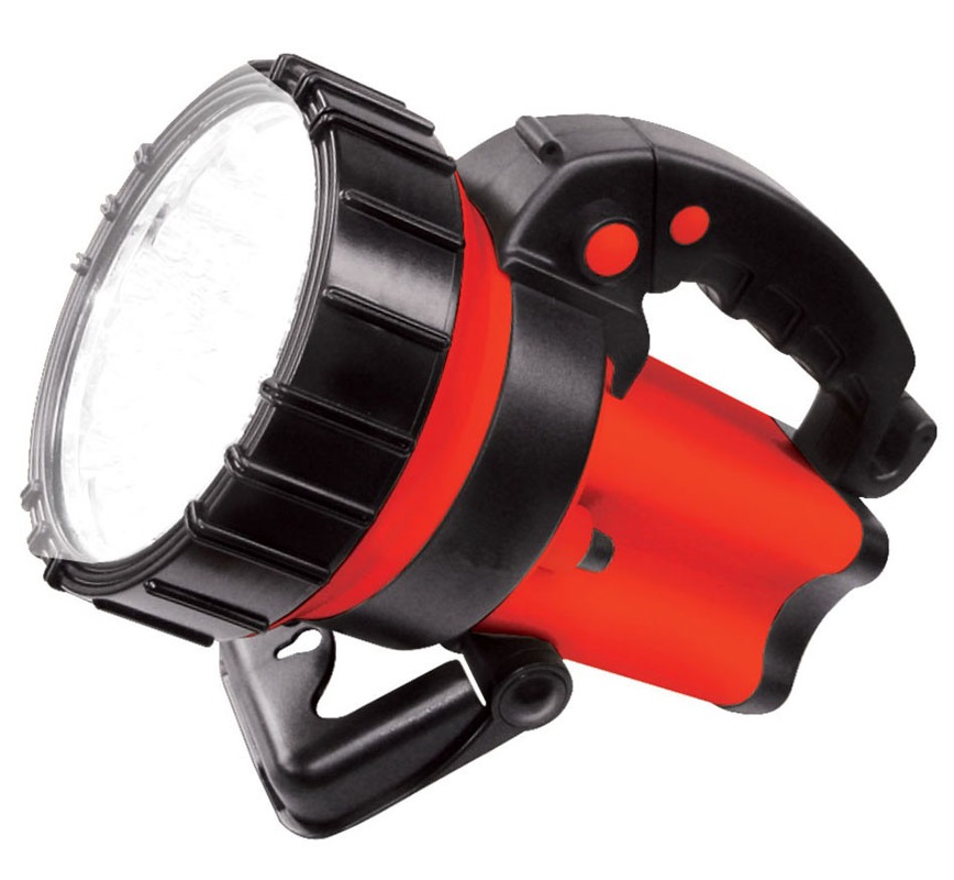 Luminario tipo linterna foco led recargable de 5 watts de 6 millones de candelas, ademas cargador para el auto y el toma corriente, con luz roja de emergencia y soporte ajustable.
