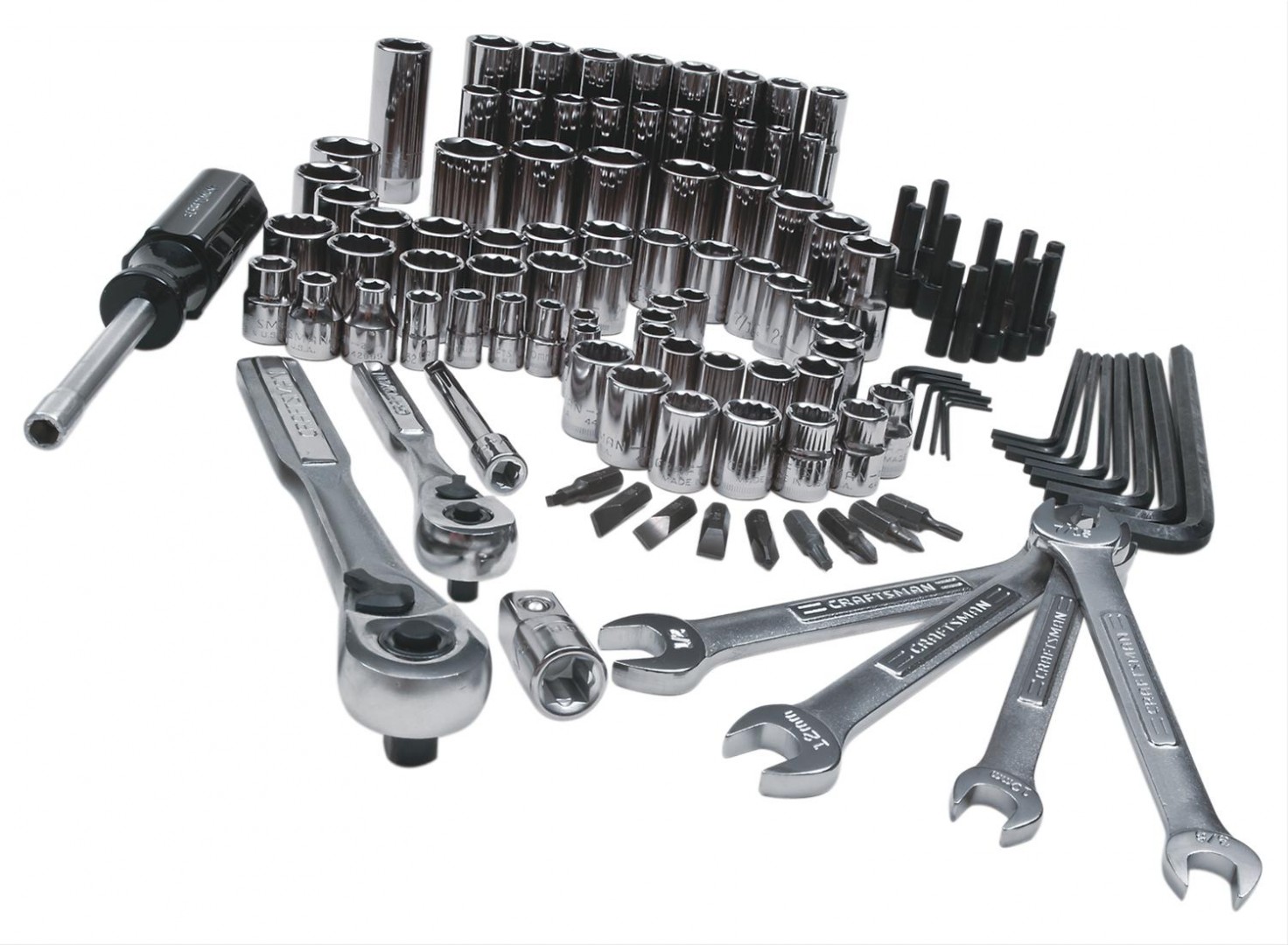 Craftsman Juego Mecánico 117 Piezas Mandos 1/4, 3/8 y 1/2 SAE y Métrico Estas herramientas están hechas de acero de aleación ultra resistente que está tratado térmicamente y templado para garantizar su resistencia, y chapado en níquel cromado para resistir la corrosión y simplificar la limpieza.