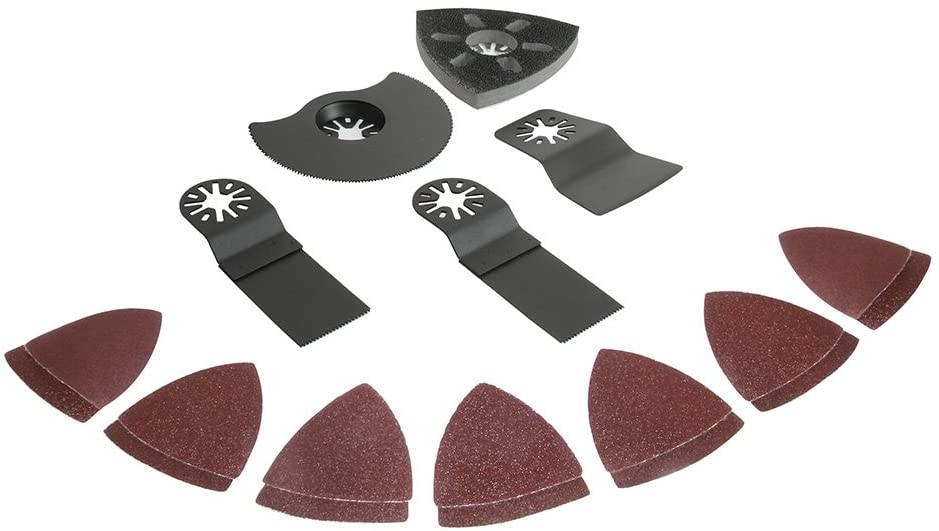 1 raspador, 2 hojas de sierra 65 Mn, 1 sierra de media luna, 1 almohadilla de lijado, 14 de repuestos de lijas