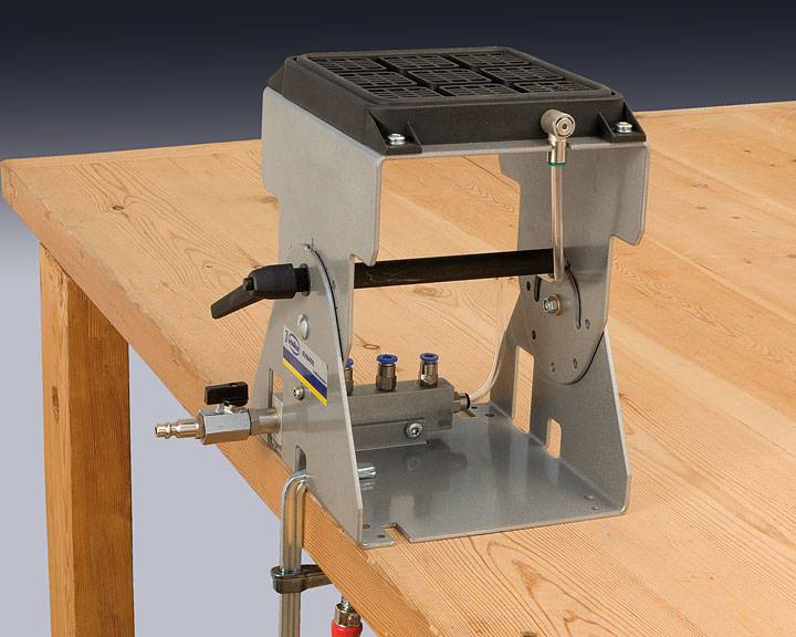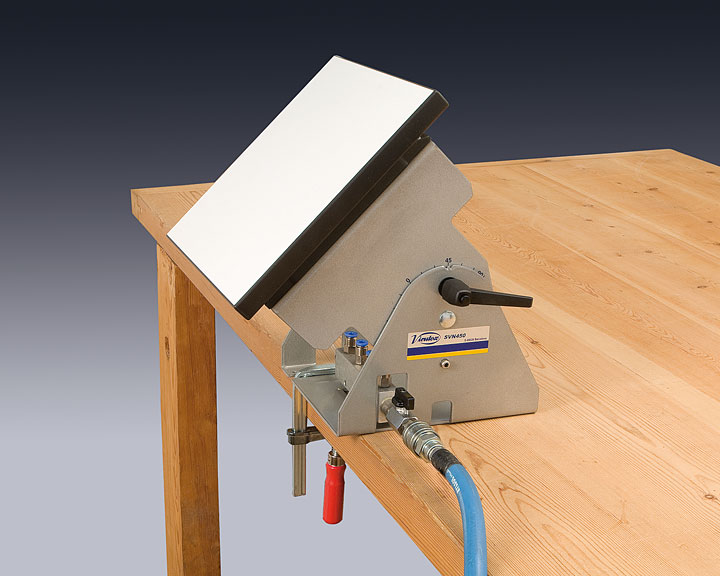El sistema basculante de fijación SVN450 esta formado por un sistema básico SVN250, montado sobre un soporte abatible. Permite el mecanizado de un borde y la cara de la pieza sin cambiar de sujeción. Incorpora un distribuidor de aire con cuatro salidas libres, que permiten la conexión de unidades auxiliares SVN470 o SVN250, equipado con llave de paso y conector rápido a la red neumática.Precio Neto