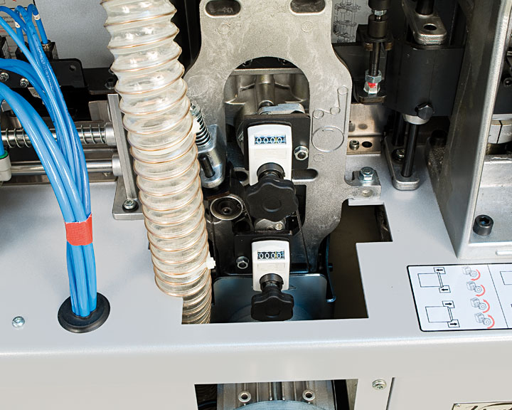 Regulación simultánea con un sólo contador digital, para el espesor del canto y las posiciones de la guía de entrada y del rodillo aplicador de cola.