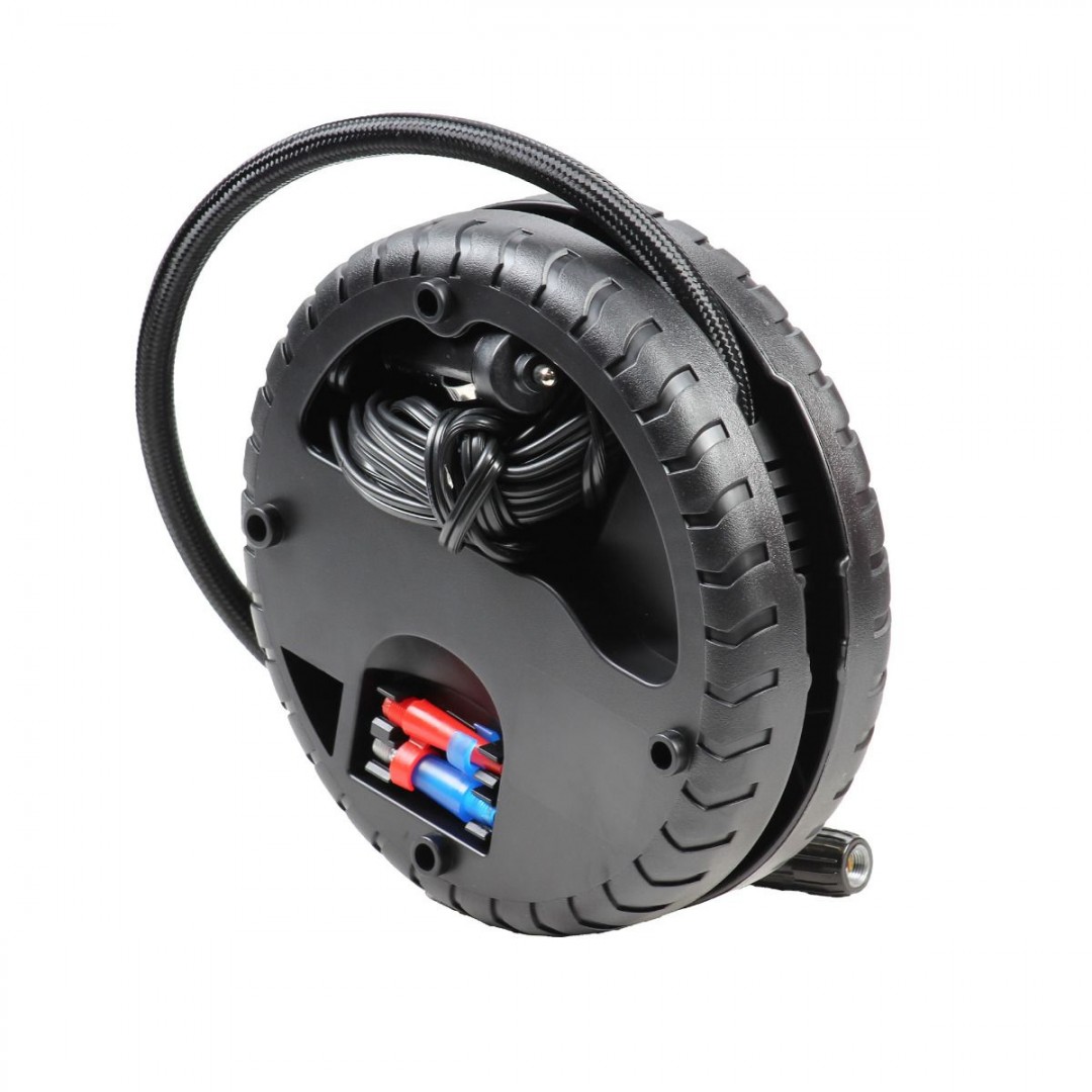 Cuenta con manómetro, 3 adaptadores tipo aguja, boquilla, cordón eléctrico de 3 mts con conexión de 12 V y manguera de aire 38 cm.