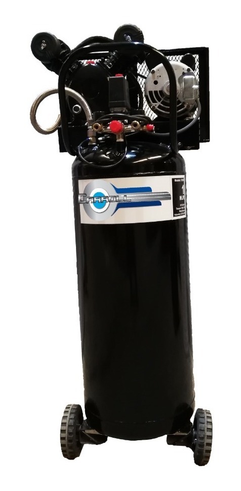 Motor monofásico 1 hp 110/220v, presión 115lbs/pulg2, volumen 6.5 cfm, tanque vertical de 108 lts. c/ ruedas de 6"