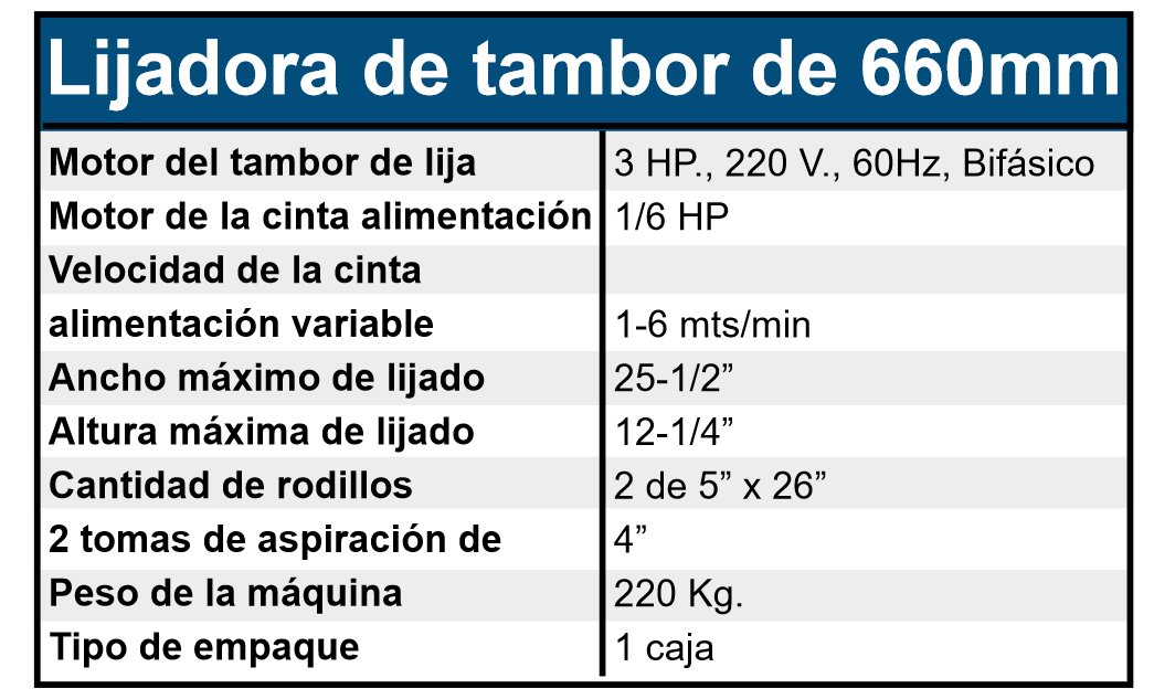 Motor del tambor de lija: 3 HP 220 V 60Hz Bifásico.