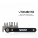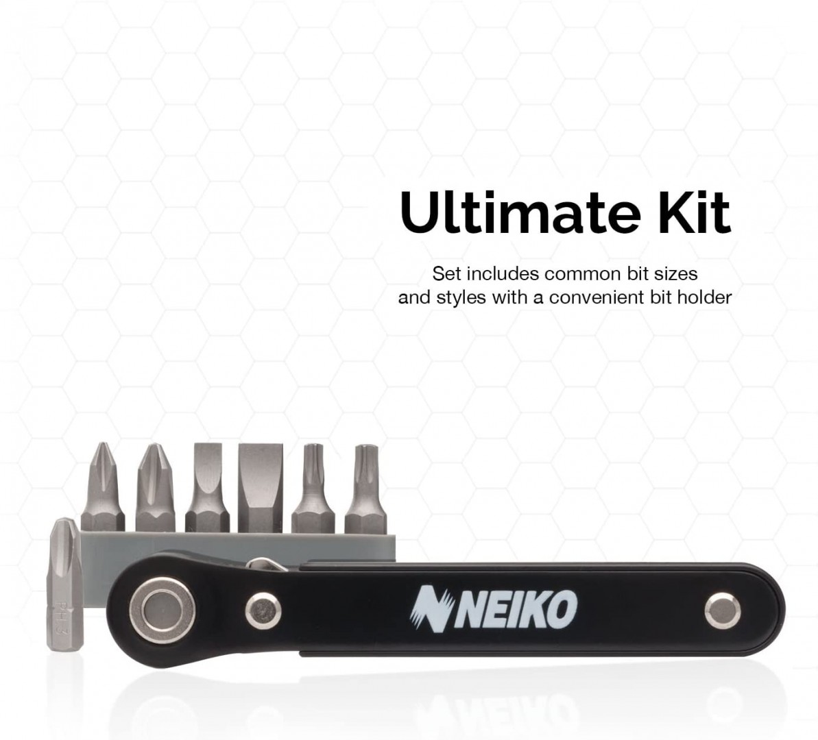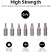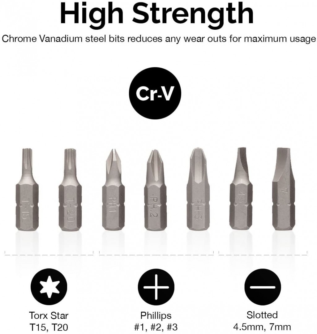 El juego incluye 7 puntas de 2,5 cm en un organizador: 3 piezas Phillips (#1, #2 y #3), 2 piezas ranuradas (4,5 mm y 7 mm), y 2 piezas Torx Star (T15 y T20)