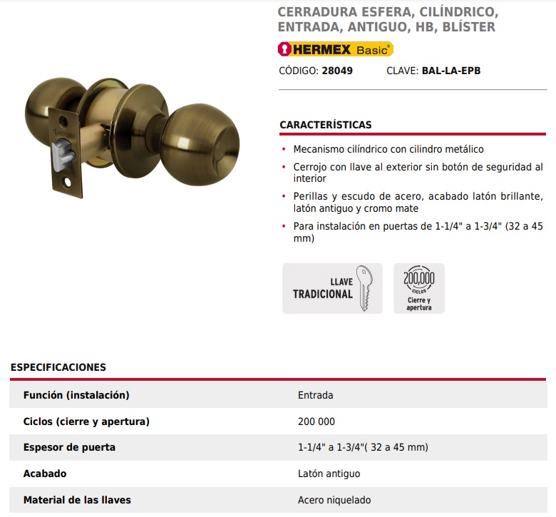 El producto real puede variar a la imagen presentada Cerradura esfera, cilíndrico, entrada, antiguo, hb, blíster