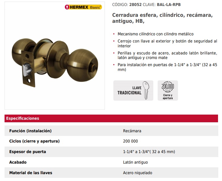 El producto real puede variar a la imagen presentada Cerradura esfera, cilíndrico, recámara, antiguo, HB