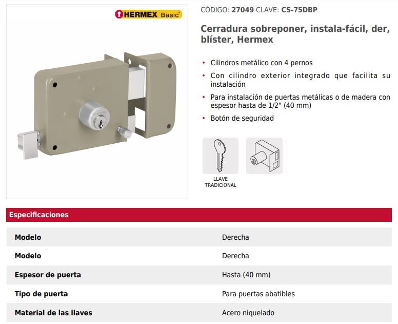Para instalación de puertas metálicas o de madera con espesor hasta de 1/2" (40 mm)