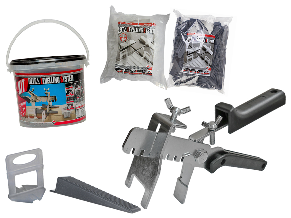 Sistema rápido de nivelación. Evita la generación de cejas durante la colocación de baldosas cerámicas, tanto en pavimentos como en revestimientos. Para formatos de 30x30 cm y superiores. Siempre con doble encolado. Garantiza la planitud y regularidad de la superficie de colocación. Uso fácil e intuitivo. Retirada del sistema por impacto. El kit incluye: