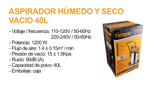 Accesorios incluidos: 1pcs manguera flexible, 1pcs cepillo, 1pcs tubo plástico, 1pcs filtro HEFA APLICACIONES: - Aspirado de Líquidos y Sólidos. - Aspiración en la Industria Hotelera. - Aspirado en la Industria Automotriz, como Autolavados. - Aspiración en todo tipo de Industria.