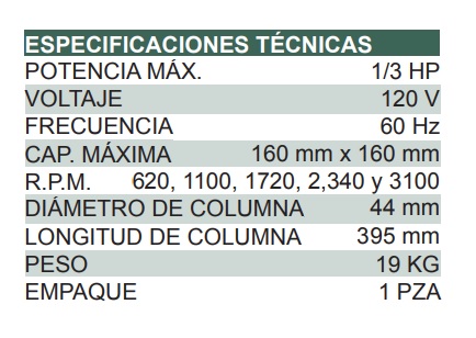 Motor: 3/4 HP 110V 60Hz 1 fase Velocidades: 1