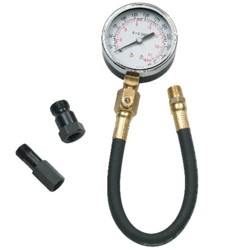 Los adaptadores encajan en los agujeros de 14 y 18 mm de las bujías y una válvula especial de aire comprimido se incluye para reiniciar el calibrador fácilmente