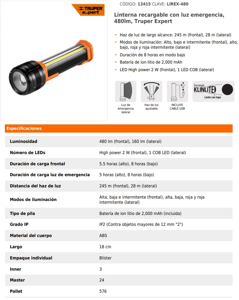 LED High power 2 W (frontal), 1 LED COB (lateral)