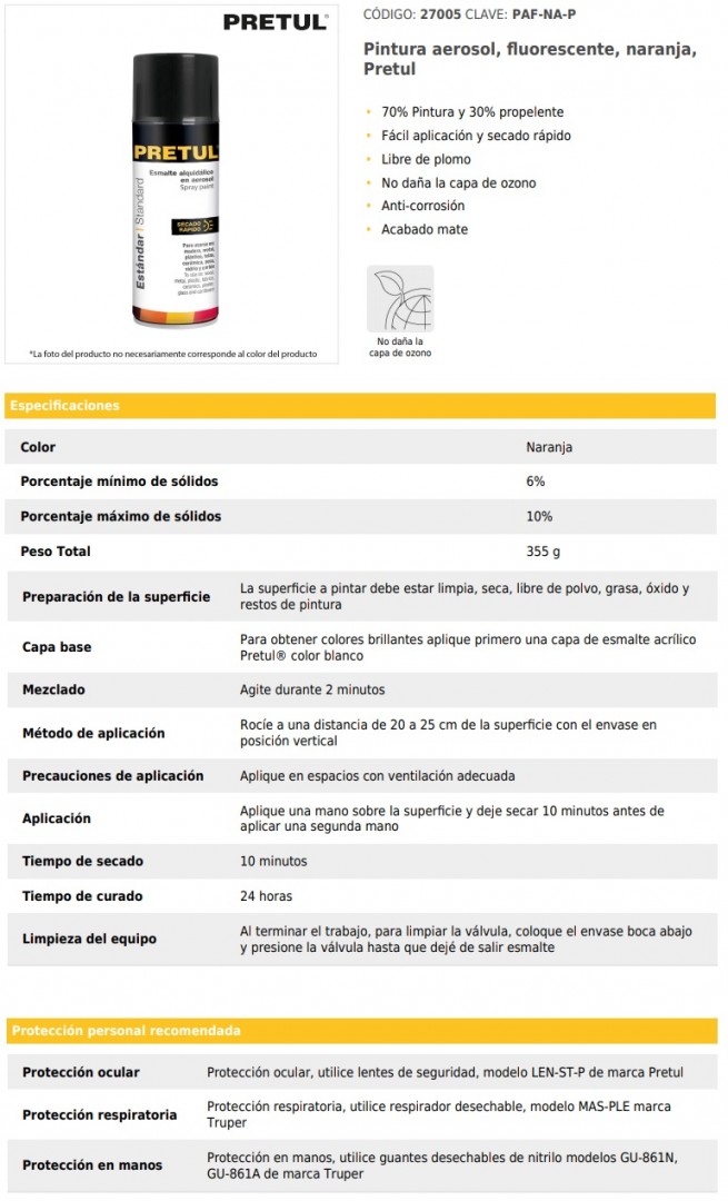 El producto real puede variar a la imagen presentada Pintura aerosol, fluorescente, naranja