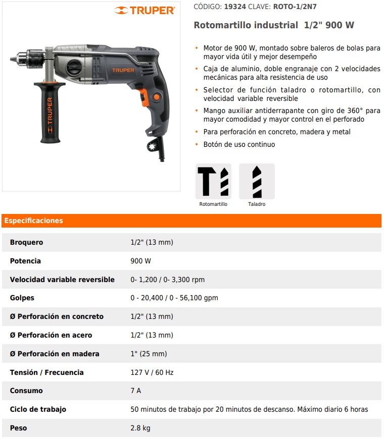 Selector de función taladro o rotomartillo, con velocidad variable reversible