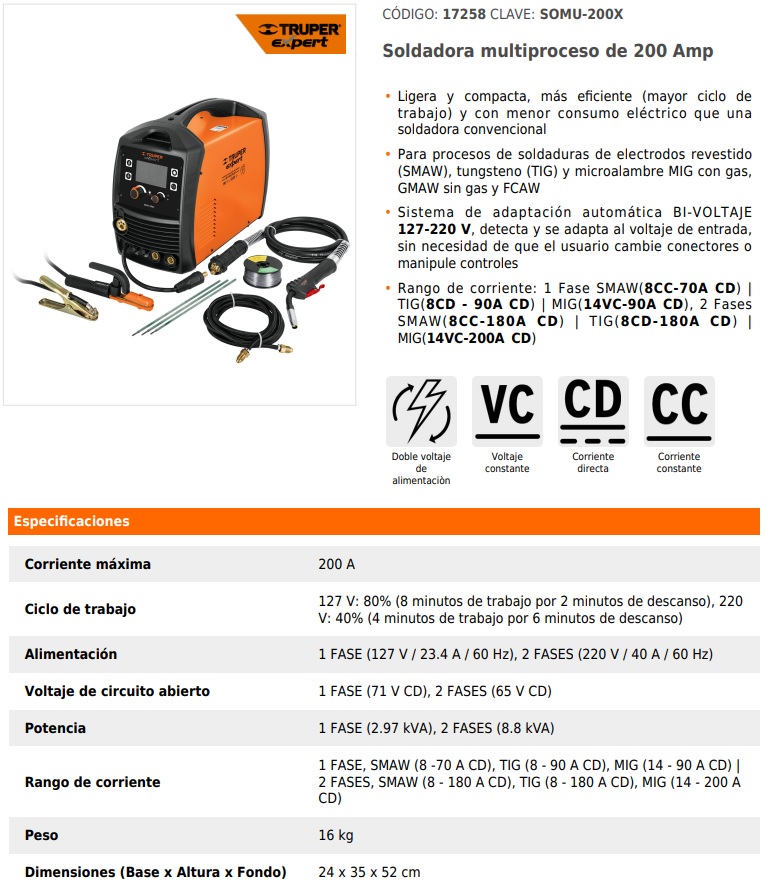 Rango de corriente: 1 Fase SMAW(8CC-70A CD) | TIG(8CD - 90A CD) | MIG(14VC-90A CD), 2 Fases SMAW(8CC-180A CD) | TIG(8CD-180A CD) | MIG(14VC-200A CD)