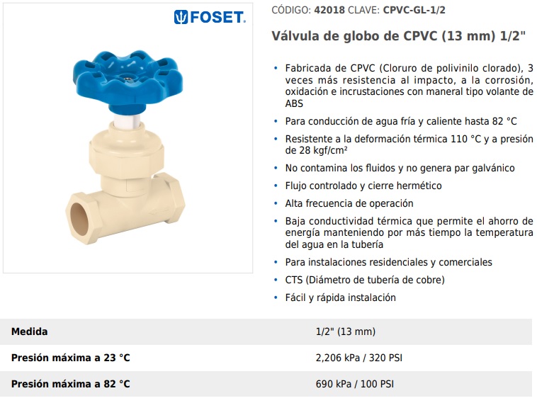 Fabricada de CPVC (Cloruro de polivinilo clorado), 3 veces más resistencia al impacto, a la corrosión, oxidación e incrustaciones con maneral tipo volante de ABS