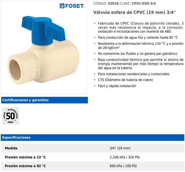 Fabricadas de CPVC (Cloruro de polivinilo clorado), 3 veces más resistencia al impacto, a la corrosión, oxidación e incrustaciones con manerales de ABS