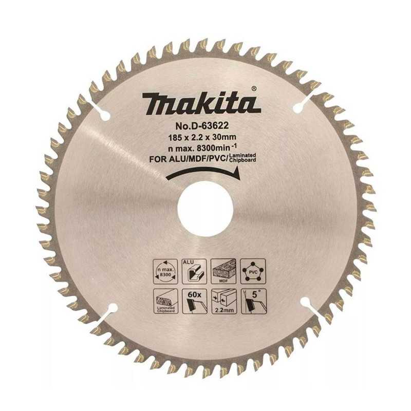 La hoja de sierra circular multiuso D-63622 Makita de 185 mm 60 dientes cuenta con 60 dientes con punta de carburo en un ángulo de 5 grados con una ranura de 2,2 mm, lo que hace que la hoja sea adecuada para varios tipos de materiales, incluidos, entre otros, aluminio, MDF, PVC y laminado. Cartón madera. Viene completo con 4 anillos espaciadores para adaptarse a varios tamaños de orificio: anillos de 15, 88, 16, 19 y 20 mmEspecificaciones -60 dientes con punta de carburo. -Ranura de 2,2 mm -Máximo 8300 RPM