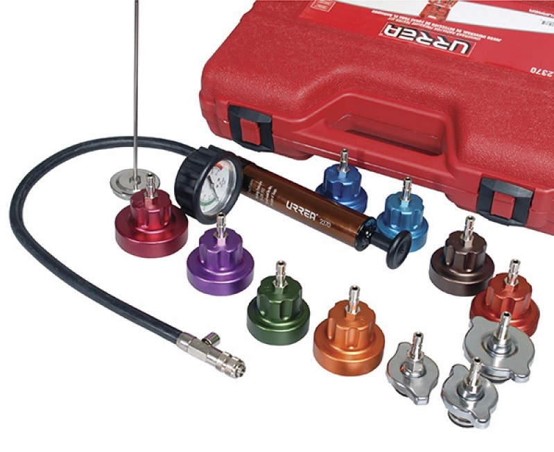 Inyecta aire a presión hacia el radiador, por medio de la bomba y el adaptador adecuado, si existe fuga, el manómetro detecta la caida de presión.