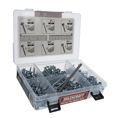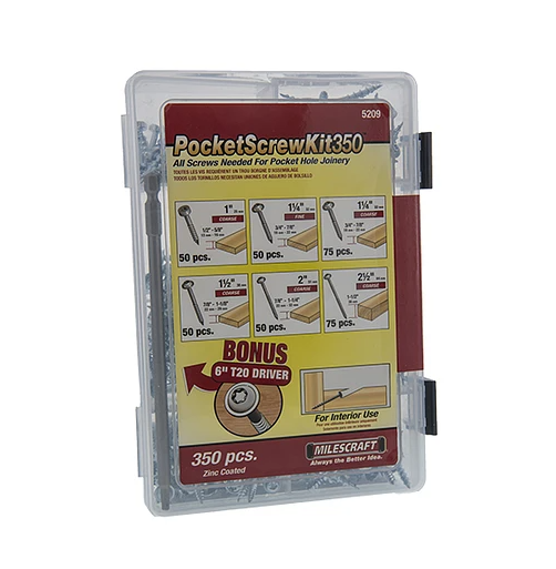 Los tornillos autorroscantes T20 Star con recubrimiento de zinc son perfectos para unir sus piezas de trabajo, garantizando una sujeción segura. PocketScrewKit350 incluye 350 unidades de los tornillos para agujeros de bolsillo más comunes.