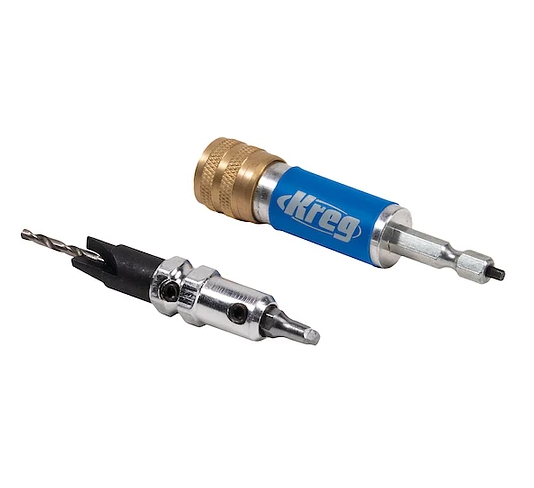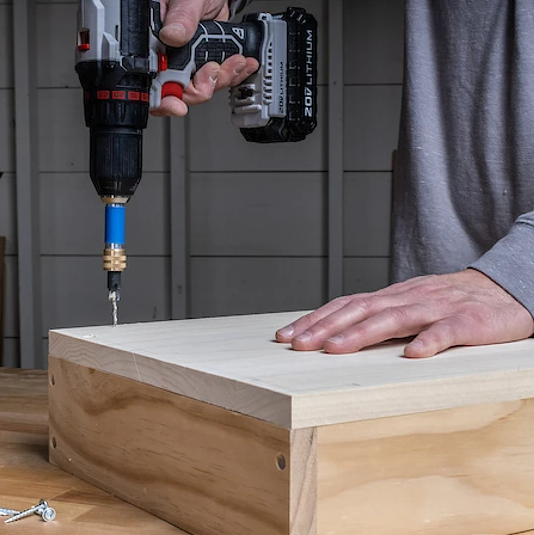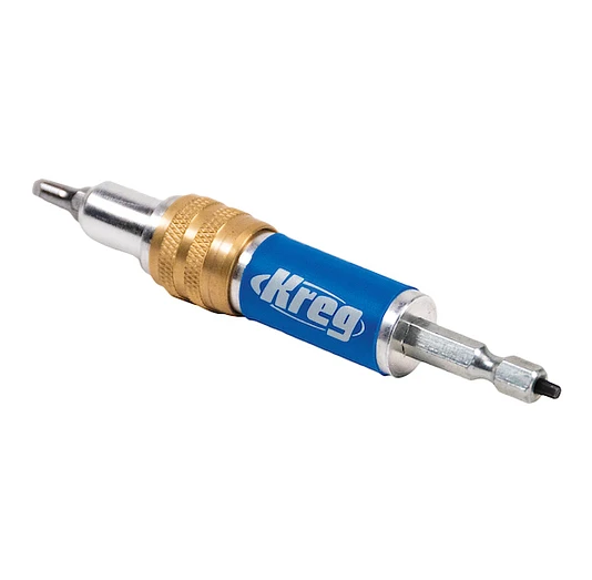 Con el Quick-Flip, puede crear una variedad de uniones fuertes y sencillas utilizando los tornillos Kreg®. Perfora un agujero piloto y avellanado con un lado, luego clava un tornillo Kreg con la broca cuadrada nº 2 en el otro lado. Ahora puede utilizar los tornillos Kreg para varias aplicaciones, como la unión de esquinas, la fijación de falsos frentes a los cajones y mucho más, todo con una sola herramienta. El Quick-Flip se acopla a cualquier taladro.