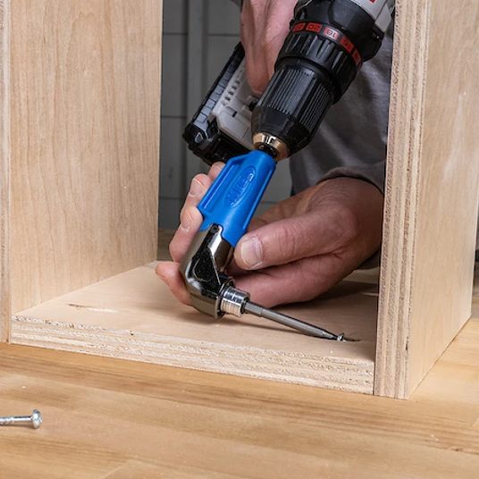 El atornillador de bolsillo de 90° convierte su taladro en un atornillador de 90° para llegar a espacios reducidos. Este accesorio de taladro compacto le permite atornillar en lugares que normalmente no podría alcanzar con su taladro. La broca cuadrada de 76 mm (3") que se incluye, se encaja de forma segura y tiene una punta magnética que se bloquea en la cabeza de un tornillo de bolsillo, para que pueda atornillar con confianza, sin importar dónde se encuentre. El destornillador es apto para impactos y funciona con todas las brocas hexagonales